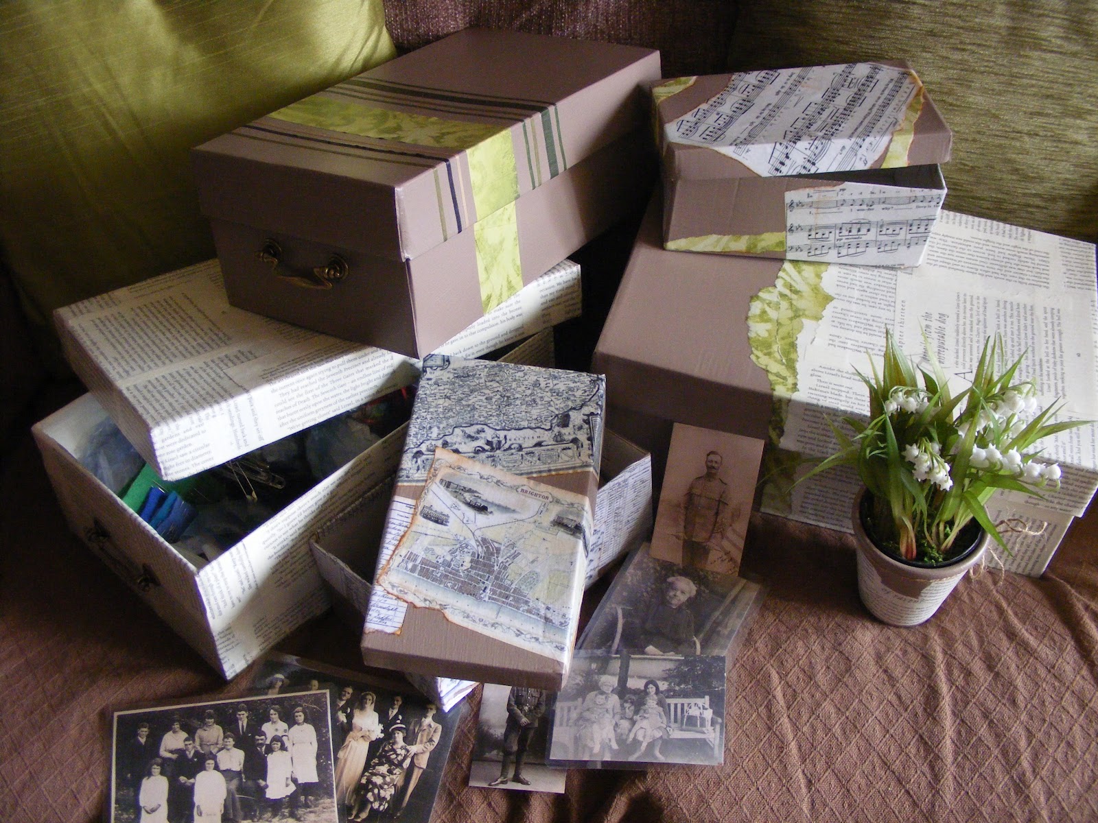 The room is now de-cluttered and I decided to match covered shoe-boxes in the room’s colours. Hence the boxes below. I keep my sewing kit in my book page box, and family history photos in the small box covered with aged maps from my home town. The other boxes are waiting to be filled, but look so much better than stuff and papers piling up everywhere!