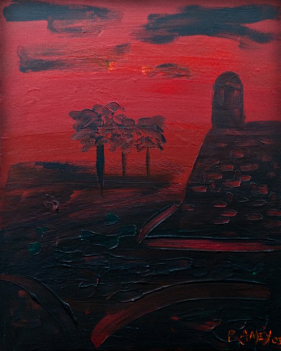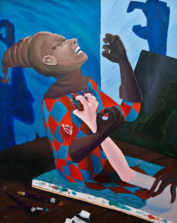 I guess because I am all over the place I don’t really have a favourite. I think that many of my pen-and-ink “stipple” pieces are quite good – I look at some of them now and don’t even know how I pulled them off. My personal favourite, though, is an acrylic painting from 2004. I’m not the best painter, but I am still so thrilled with the finished product, and with the depth of symbolism going on in there. It’s called The Great Escape, and it features a character that showed up in a few paintings of mine many years back, called the Merry Prankster. He was sort of a mischievous harlequin-garbed clown character, and represented change – usually traumatic life change that you just have to laugh about because it’s just so ridiculously overwhelming. In this particular painting, he’s rising up out of a painting, so from 2-D to 3-D. He’s trying to escape his situation. But there’s a hand also rising up out of the painting, pulling him back in. It’s a female hand, and obviously represents a relationship memory or situation. He’s caught there, mid-flight, with the past literally trying to pull him back down onto the canvas. It was the last time I ever painted the Prankster, so I guess he’s still frozen there, forever caught.