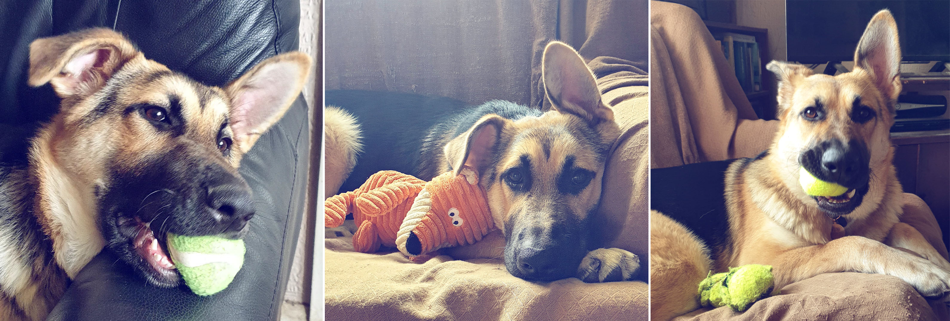 Then she started teething and losing her shark teeth… and we’re not joking, puppy teeth are like needles! We got stuck in with training, all the basics, sit, lay down, come, stay, and recall. She learned to go to bed in the dining room. She discovered she loved dumping her water bowl upside down, but even with a heavy bowl she still managed to regularly tip it up! She loved playing piggy-in-the-middle with her tennis ball! I constantly repaired her soft toys and beds as she attempted to destroy them. We searched for the holy grail of indestructible toys. We laughed at her mad zoomies, tried to distract her from things she shouldn’t have, and put up with constant puppy love bites!