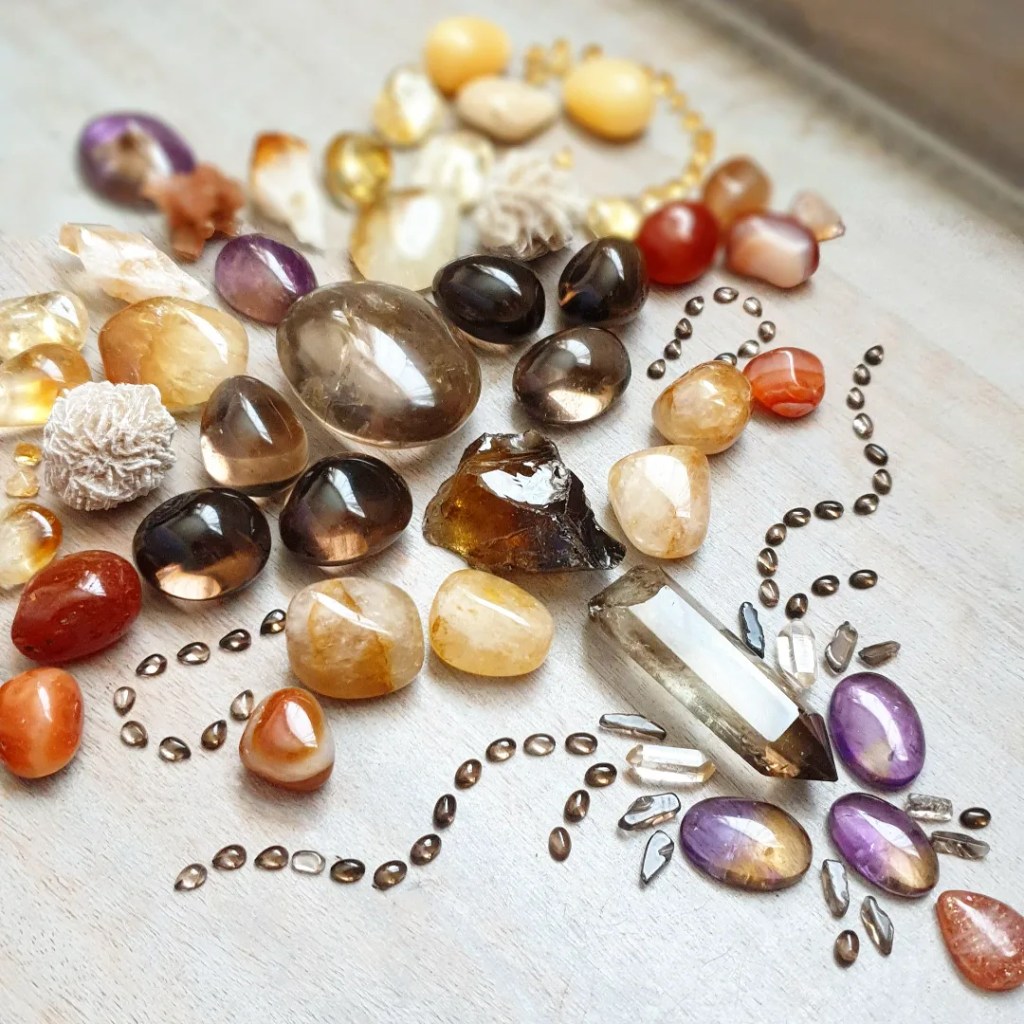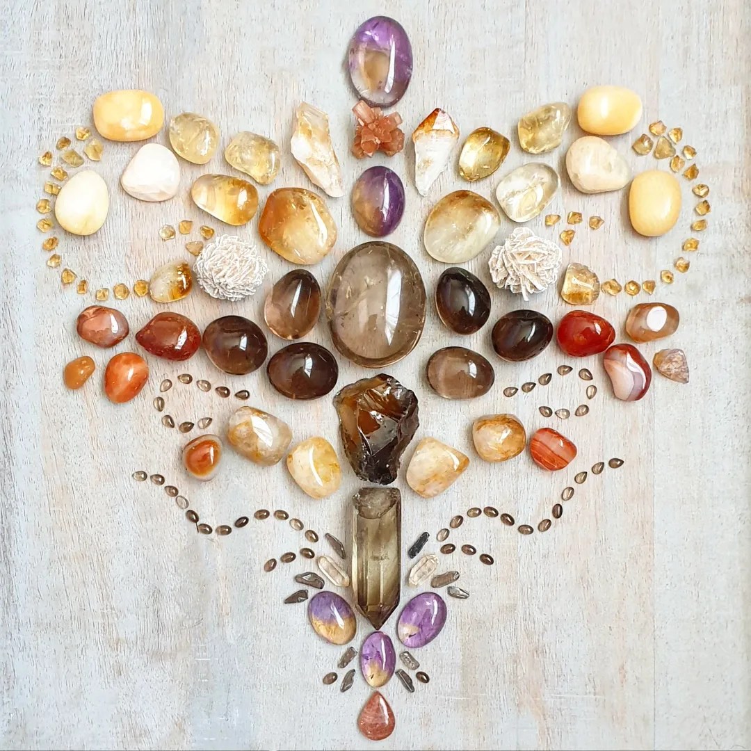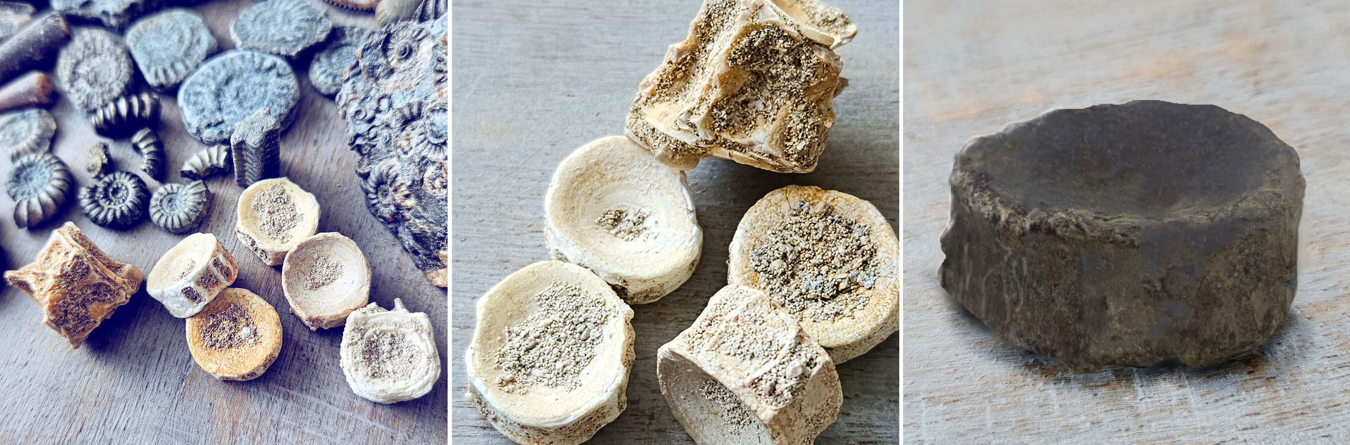I did buy a few prepared pyritised ammonites, a calcite ammonite, half ammonite pebbles, an ammonite fossilised piece of rock, cream-coloured dinosaur vertebrae, and a few crinoid stars from the local fossil shops. I wanted to make a crystal grid back home with my fossils!