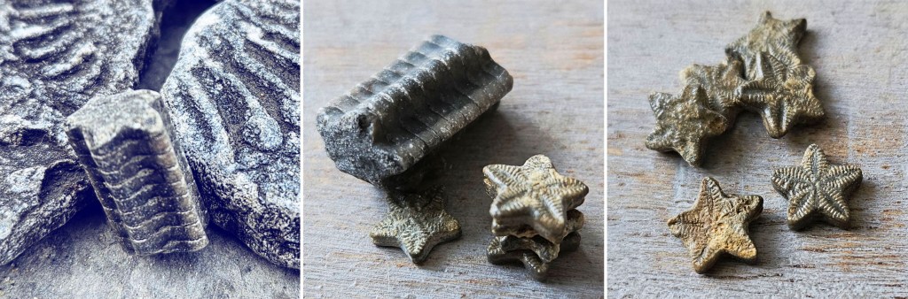 Crinoid stems or stars are the fossils of an extinct sea lily, a sort of biological anemone. It had long stems with fern-like fronds which waved around in the ocean. Some stones are imprinted with the stem and frond fossils, and you can find crinoid stems. The stems are made from segments of star shaped pieces, which can be found as a stack or as single tiny stars.