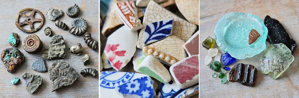 There are plenty more treasure to find, depending on what you call a treasure! You remember that I said the Victorians dumped their rubbish on the cliffs… the beach is strewn with their remnants. Beware that amid the pebbles, sand, and rocks, glass is all across the beach. Most of it is sea washed and has become sea glass, but some sharp pieces still remain. There are huge pieces of metal, piping, springs, broken cogs, equipment, broken china, tiles, bottle tops, Verdigris copper fragments, marbles, toys, and even bullets from the wars to be found or searched through.