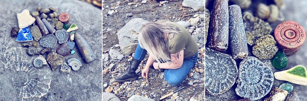 That first afternoon on the beach we spent a lot of time sifting through tiny stones and pebbles with our fingers, and with a piece of piping I’d found. We found beef shale fossils quite easily, and a few belemnites. I found lovely pieces of broken crockery, sea glass, a tiny cog, my frozen charlotte, and a marble. There were lots of pyrite, from the weird bubbly organic pieces which looked like bubbly grey-gold stones, to glittery pyrite. I searched frantically for pyritised ammonites, which was what I wanted to find the most, but I didn’t find any. I really wanted a pyritised ammonite and a crinoid, but as everyone began to leave, I’d not found those.