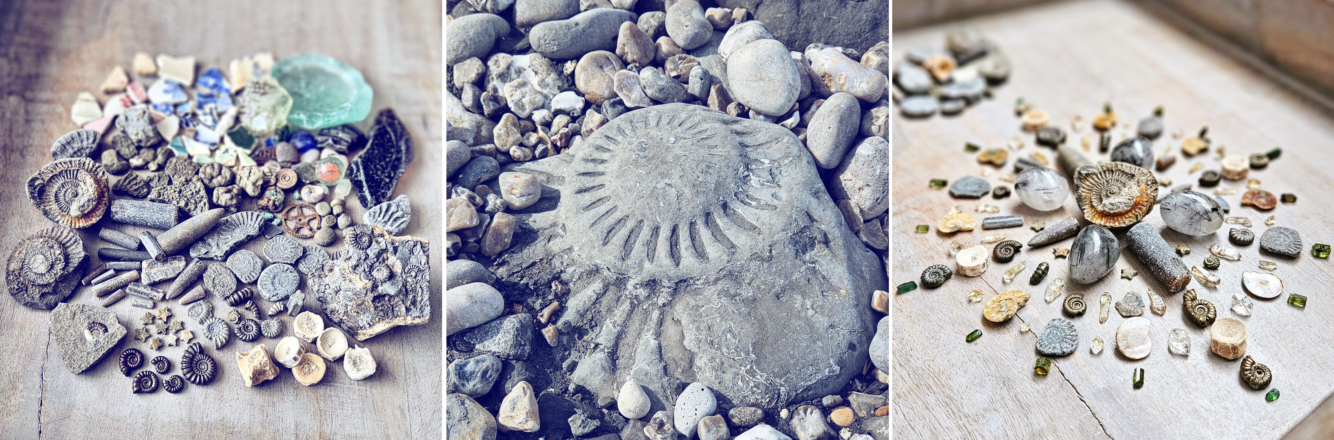 The easiest ammonite fossils to find are beef shale fossils. The stones are grey and thick. Beef shale is the base rock the cliffs are made from and with mudslides and rock falls they are the most obvious fossils. You can find ammonite impressions and fossils in small pieces of beef shale across the beach.
