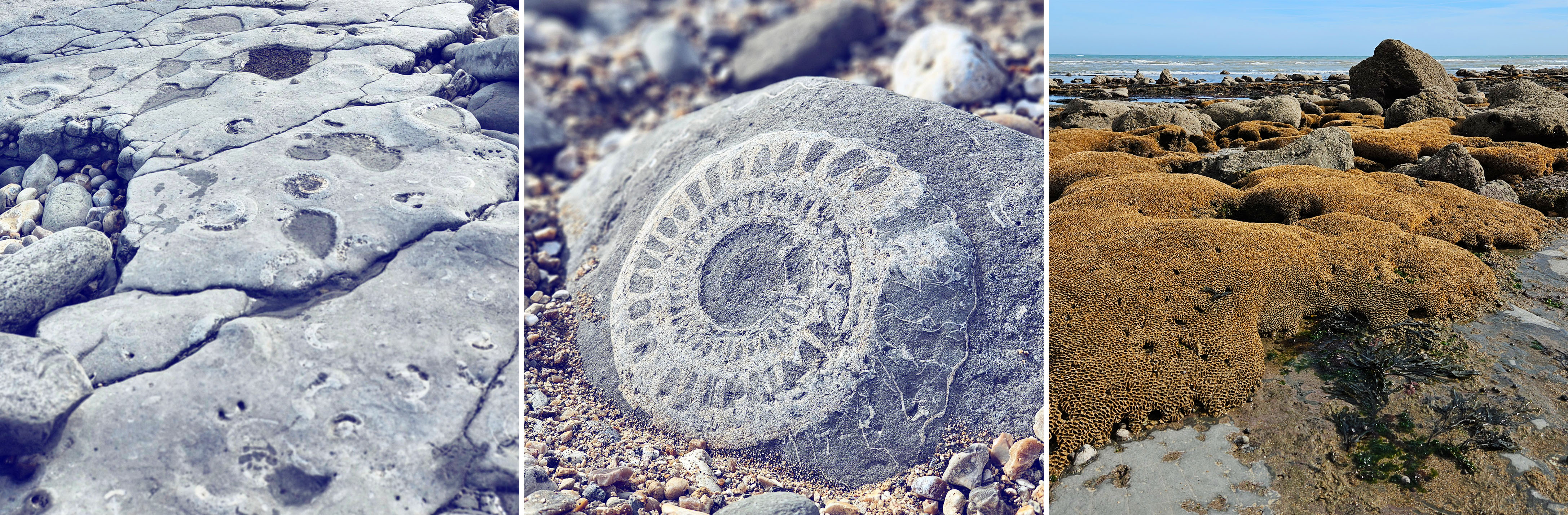 We walked west along the promenade towards the harbour and down to Monmouthbeach. It’s a fair walk across pebbles, rocks, and boulders to find the Ammonite Pavement. It erodes more each year, but the pavement is there on a limestone ledge at low tide. Ammonite fossils embedded into the limestone slab from the Late Triassic period. Seeing them and all the large ammonite fossils preserved and imprinted into rocks and boulders was our first moment of Jurassic wonder. The fossils and the swathe of honeycomb tube worm reef were quite a sight to behold!