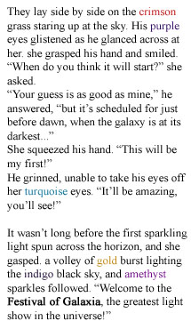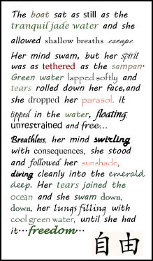 Alice felt tears spill as she backed out of the water. Her heart hammered and knots of tension loosed. Goosebumps erupted from head to toe and she sank to the wet sand, her hands trembling as the surf gently embraced her. She watched the blur of orange and denim and newfound innocence engulfed her. Her eyes shone as a slow smile curved and shaky laughter rippled from her lips, and her fingers trailed, tenderly, across her newly rounded stomach.