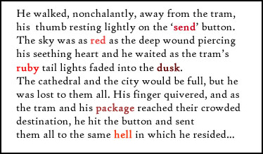 She stumbled towards the shore kicking up clouds of sand that swept across the beach behind her. Her legs, now heavy and awkward, propelled her on across the tide line, across the mounds of wet seaweed, and the sand firmed beneath her toes. She jogged, her feet slapping the glaze of water, wet sand splashing up her legs and tears welling again behind red eyes. The waves ebbed and flowed, the gentle rhythm matching the leaden beat of her heart, as she waded into the sea.