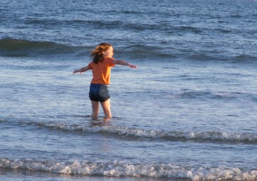 Knee-deep, Alice watched as the small girl in the orange shirt threw out her arms with abandon and turned her face towards the glorious evening sun, enjoying the simple delight of waves dancing around her legs, wind on her arms and the warmth of the sun on her face.